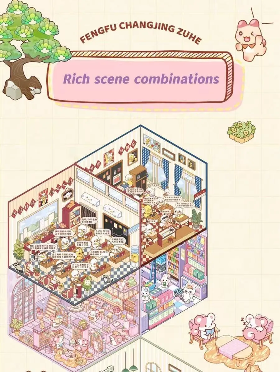 Bu miniatürləşdirilmiş səhnə stiker kitabında hər bir cilddə müxtəlif üslubları əhatə edən 10 fərqli temalı səhnə var. O, stressi azaltma, əyləncə, intellektual inkişaf və dekorasiya funksiyalarını özündə birləşdirərək, onu uşaqlar, yeniyetmələr və gənclər üçün uyğun edir. Bu, gündəlik asudə vaxt, valideyn-uşaq qarşılıqlı əlaqəsi və festivallar üçün hədiyyə kimi əla seçimdir.