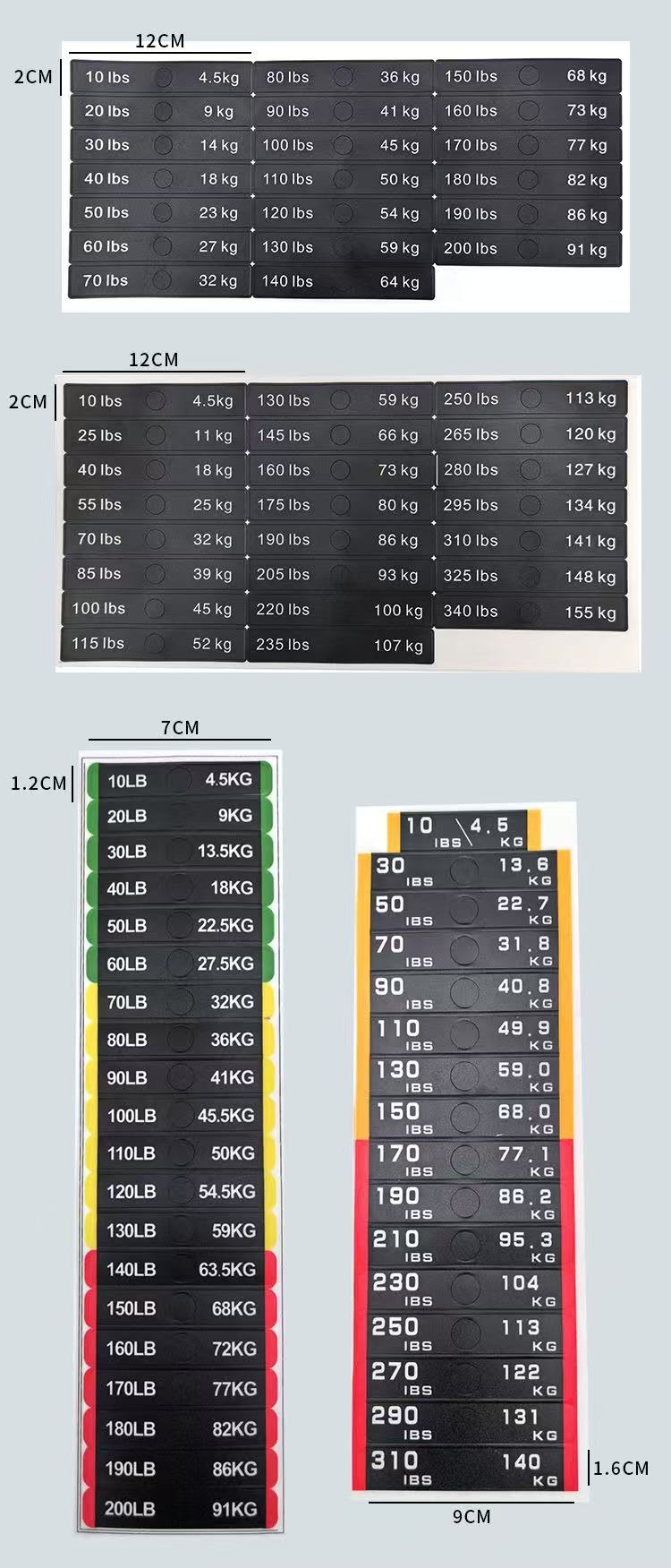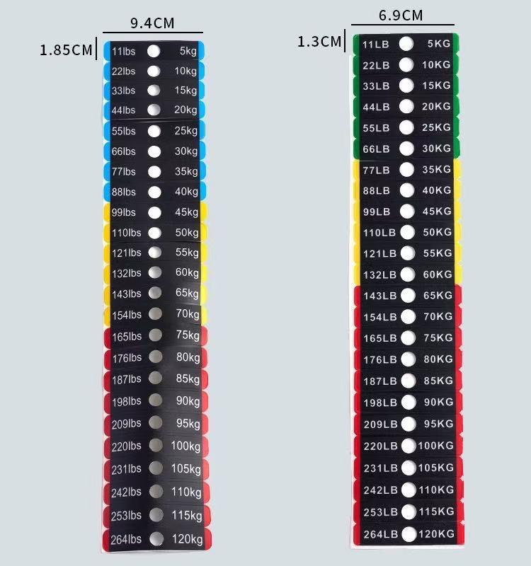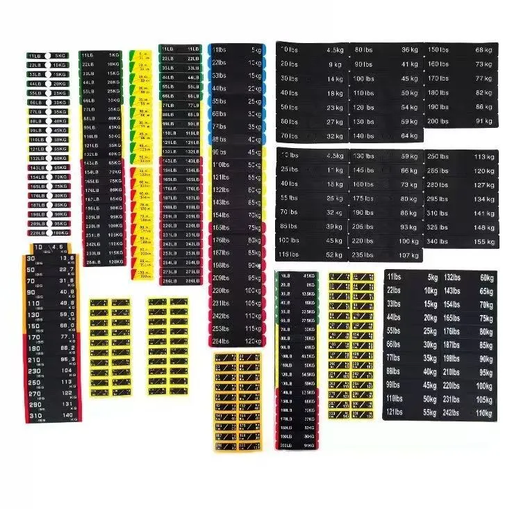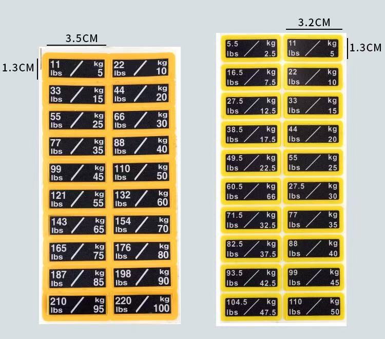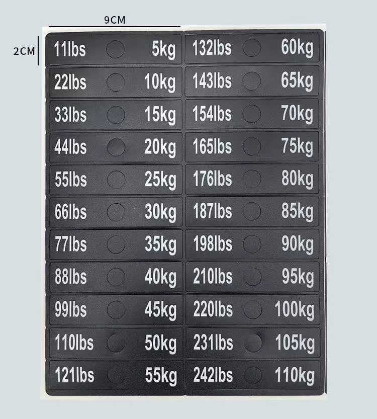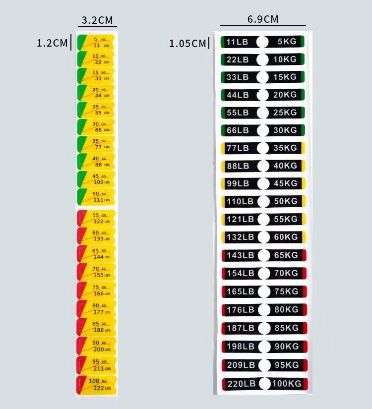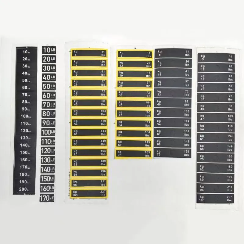 Fitnes avadanlığının çəki blokları üçün bu çəki stikerləri fitnes qurğusunun çəkisini etiketləmək üçün xüsusi olaraq hazırlanmış bir növ identifikasiya stikerləridir. Onlar adətən PVC materialdan hazırlanır və xüsusi ölçülər üçün məhsulun parametr cədvəlinə müraciət edə bilərsiniz. Çəki dəyərləri stikerlərdə aydın şəkildə qeyd olunub ki, bu da istifadəçilərə uyğun məşq çəkisini tez müəyyən etməyə və seçməyə imkan verir.